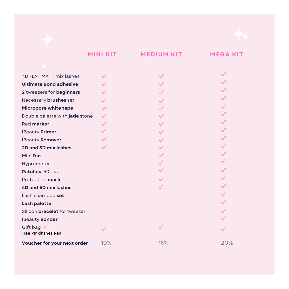 În plus, la toate pachetele KIT veți primi o geanta și un catalog Pink Lashes cadou!